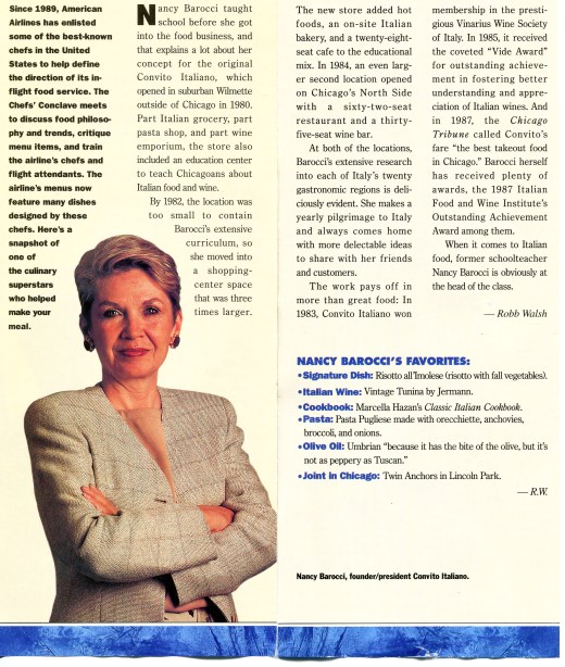 Serving the Signature Dishes was just one of the many ways American Airlines promoted us. Another was by featuring us in the American Way in-flight magazine, either in features that celebrated the Conclave in general or in individual articles. One series called Meet The Chef focused on our personal background, information about our restaurants and a list of our favorites: meals, wines, cookbooks and restaurants. The magazine would also occasionally create little blurby articles that featured wine, food and restaurant recommendations of various Conclave chefs. So over time I was profiled quite a few times. And without fail, a few weeks after publication of one of these articles, a surprising number of Convito customers would come in with their in-flight menus or torn-out magazine pages to show me. I think they were proud that they frequented a restaurant and market that was featured on the airline they had just flown, as was I! Clearly, I was not just contributing advice to AA, but my restaurant and market were getting invaluable PR in return.