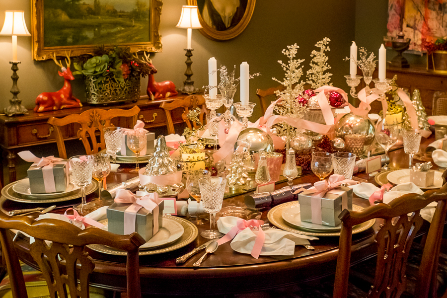 However, of late, the look of my holiday table has become another creative outlet. Ever since one of my grandchildren (Neko) made the comment “I wonder what Grammy’s table will look like this year”, I have been inspired to live up to those expectations and come up with something different each year. My themes have varied from forest animals, angels, mini fir trees amidst mini cottages (a collection from my time in England) and of course, my ever-present Santas.